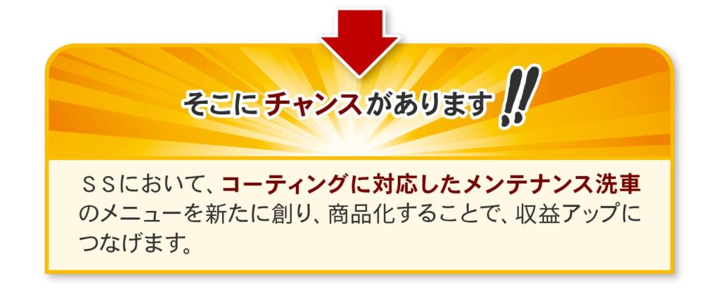 SSにおいて、コーティング車に対応した「新洗車メニュー」をご提案いたします。ポリマー洗車よりも簡単で早く(施工時間20〜30分)綺麗に仕上がります。