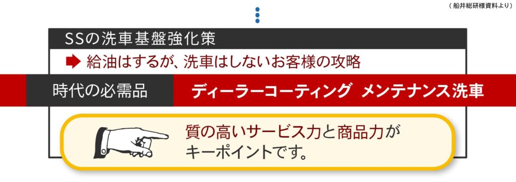 今後SSにおいて、お客様のニーズに応えられるのは、車の外装(洗車・鈑金・コーティング他)、タイヤなどの限定された商品になると考えられます。