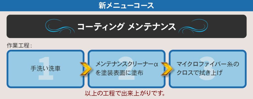 コーティングメンテナンスについて難しく考えることはありません。研磨剤が入っていない、ポリマー洗車と同様の洗車として考え、取り組んでみてください。